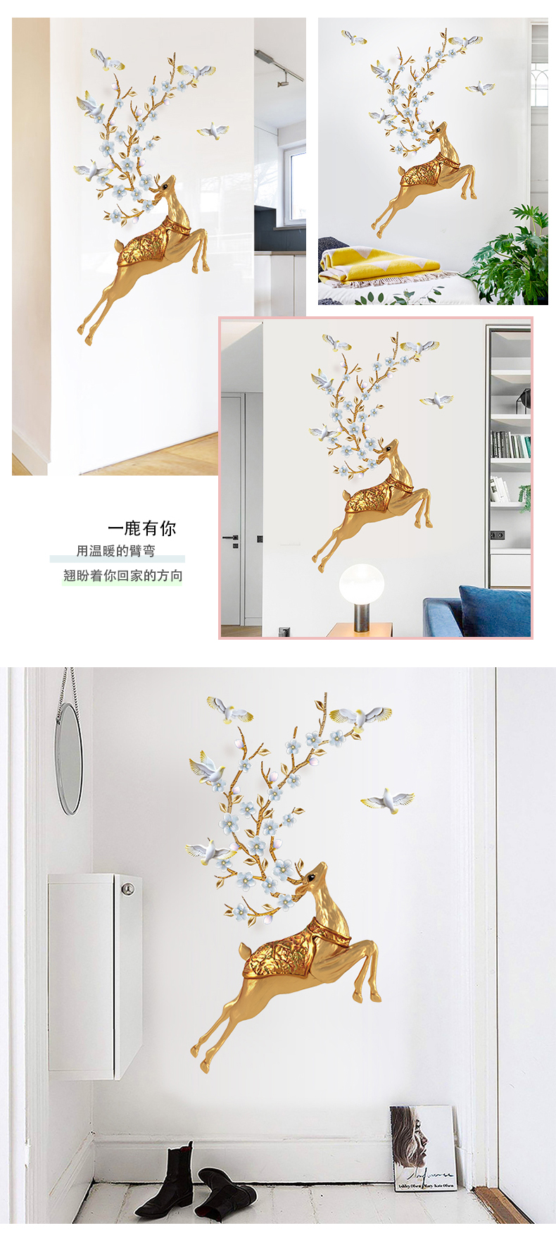 网红房间布置贴画リビング墙贴纸玄关墙面墙装饰卧室温馨墙纸自粘 3D金色玄关鹿 超大